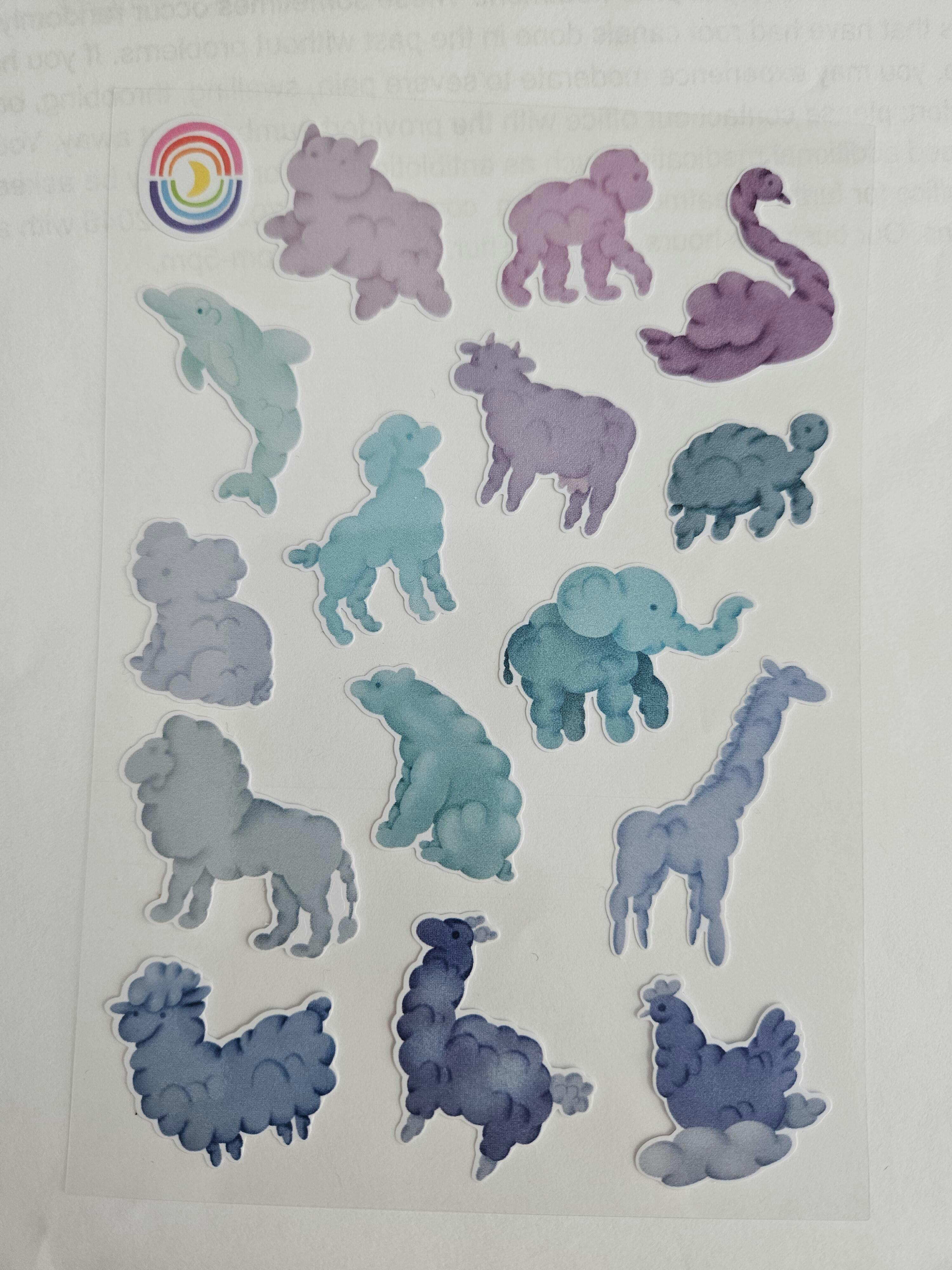 This playful sheet features 15 shimmer stickers of animal shaped clouds including an elephant, turtle, rooster, koala, dolphin and more. What animals can you spot?