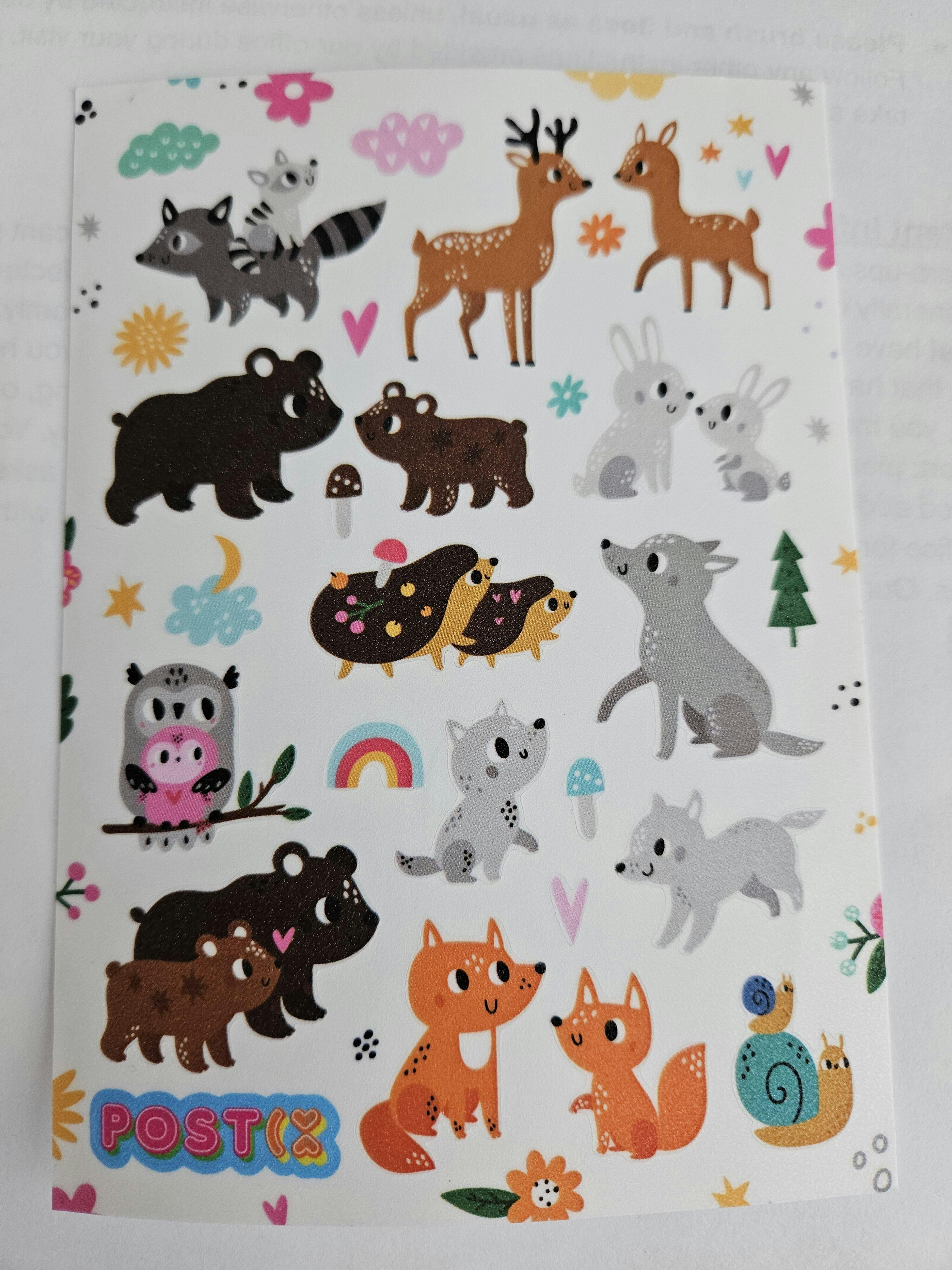 This glitter sticker sheet showcases 33 stickers and includes raccoons, foxes, owls, bears, hedgehogs, wolves, deer and rabbits.