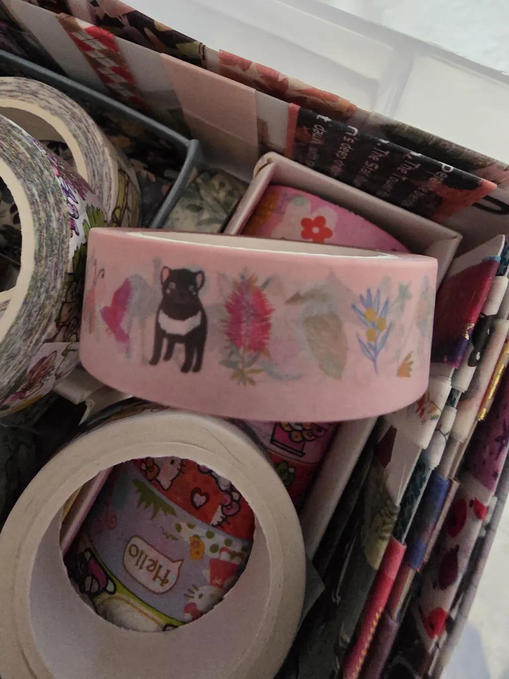 This role of washi tape is 15mm wide and 10m long and features over 55 different animals, flowers and plants including a Tasmanian devil, koala, kangaroo, numbat, kookaburra, quokka, galah, dingo and more on a soft pink-peach background.