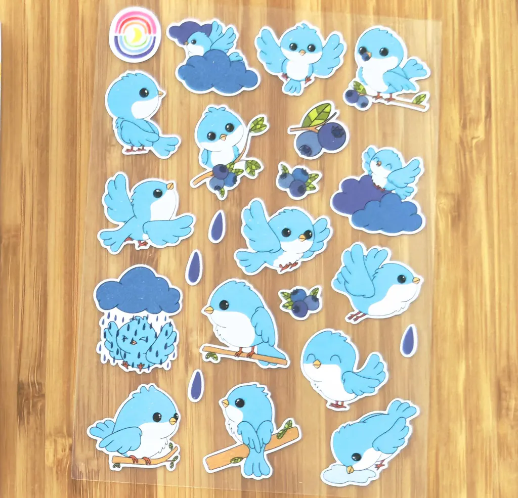 This delightful 4.1" x 5.8" (A6) sticker sheet stars a bluebird as well as blueberries and clouds. The frosted glitter finish adds that extra special touch.