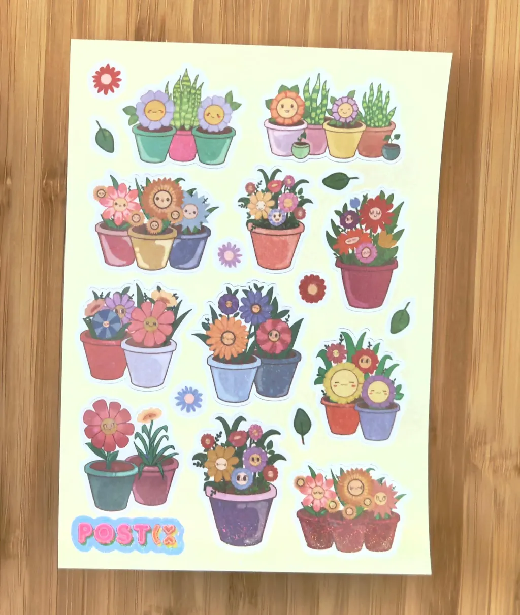 This fun sheet features 19 hologram stickers of pot plants housing smiling faced flowers.